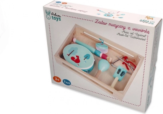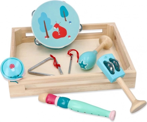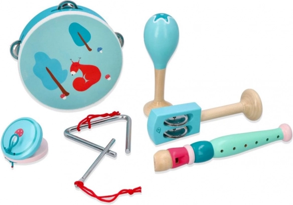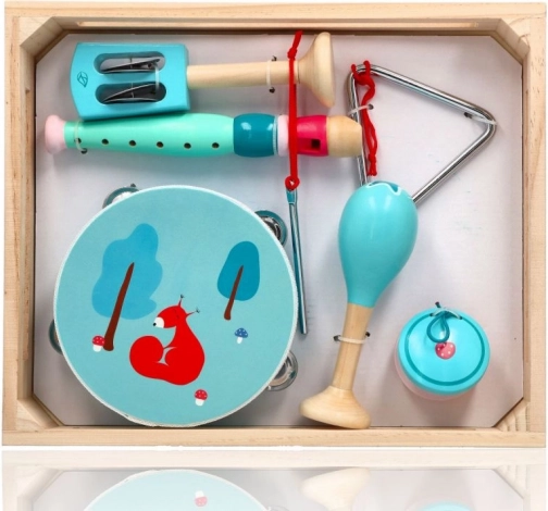 Tamburin mit Fuchs-/Eichhörnchenmotiv, Maracas, Triangel, Mundharmonika und weitere Instrumente in angenehmen Minzfarben fördern Taktgefühl und Hand-Koordination.