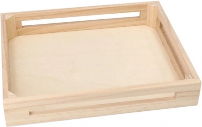 Alle Teile des Sets sind ordentlich in einem Holztablett mit Griffen verstaut – einfacher Transport, Ordnung und sichere Aufbewahrung zu Hause und im Kindergarten.