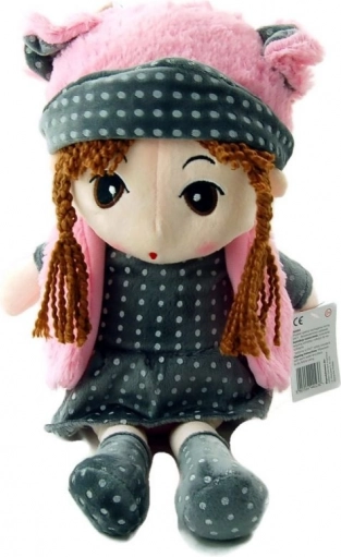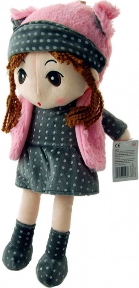 Lernen Sie Puppe Pola kennen, ein wunderschönes Plüschtier mit braunen geflochtenen Haaren, das sich mit einem grauen, gepunkteten Outfit und rosafarbenen Accessoires schmückt. Dieses weiche Spielzeug ist der ideale Begleiter für den Alltag und für ruhige Nächte.