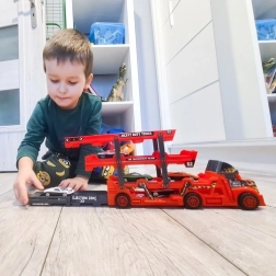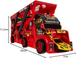 Der rote Autotransporter für kleine Rennfahrer bietet eine dreistufige Plattform, eine klappbare Heckrampe und eine vordere Ausfahrt. Enthalten sind 6 Metallautos und eine spaßige Abschussvorrichtung für Blitzstarts und actionreiches Spiel.