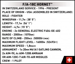 Dieses Modell ist ein großartiges Geschenk für Fans der Luftfahrt und Militärtechnik aller Altersstufen. Dank des lizenzierten Designs passt es perfekt sowohl in das Zimmer eines Teenagers als auch in ein repräsentatives Büro. Das Modell F/A-18C Hornet ersetzt die französischen Mirage IIIS in der Schweizer Luftwaffe seit 1992, als 34 Flugzeuge in verschiedenen Versionen bestellt wurden.