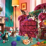 Das Puzzle zeigt ein gemütliches Wohnzimmer voller verspielter Kätzchen und bunter Wollknäuel.
