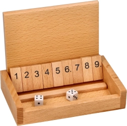Das beliebte Brettspiel Shut the Box (Chance) in praktischer Reiseausführung bietet schnelle Runden, einfache Regeln und jede Menge Spannung. Würfeln Sie mit zwei Würfeln, addieren Sie die Augen und klappen Sie die entsprechenden Zahlen um. Gewinnt, wer alle Zahlen schließen kann oder den niedrigsten Rest erzielt.