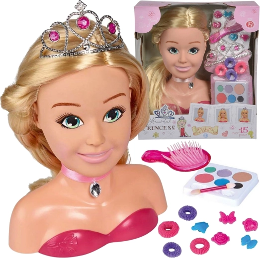 Stylingkopf PRINCESS, Krone, Bürste, 5 Haarspangen, Haargummis, Make-up-Palette mit Applikator
