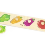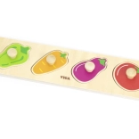 Kinder lernen auf natürliche Weise, die Farben und Formen von Gemüse – Paprika, Karotte, Aubergine und Tomate – zu erkennen und den passenden Aussparungen zuzuordnen.
