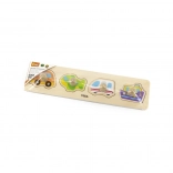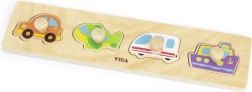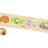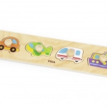 Fröhliche Farben und klare Konturen fördern die visuelle Wahrnehmung und den Wortschatz – das Kind erkennt Auto, Schiff, Flugzeug und Wohnmobil und lernt, sie zu benennen. Die hochwertige Holzverarbeitung gewährleistet eine lange Lebensdauer und sicheres Spielen.