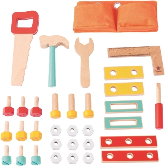 Enthält Taschen für Werkzeuge und Regale zur Spielzeugaufbewahrung, sodass Kinder Ordnung halten und die Werkzeuge leicht erkennen können.