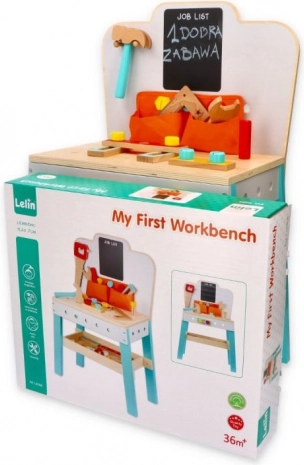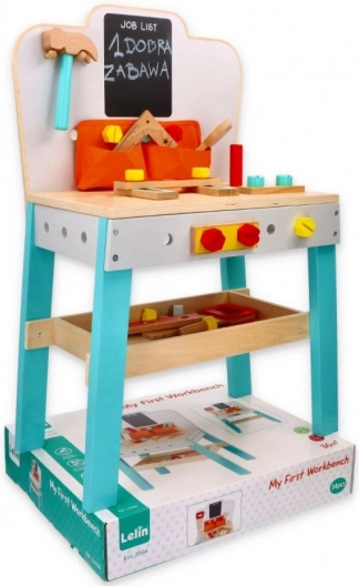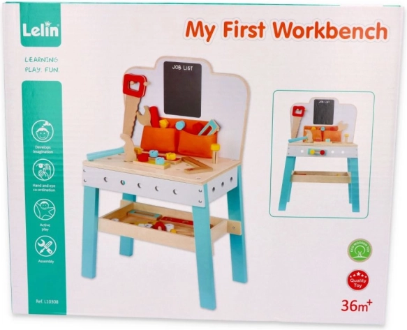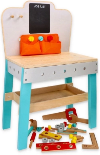 Der Kinder-Holzarbeitstisch mit Tafel ist ein ideales Geschenk für kleine Handwerker. Der Tisch enthält speziell angepasste Holzinstrumente wie Hammer, Säge und Schlüssel, die es Kindern ermöglichen, verschiedene Konstruktions- und Reparaturarbeiten zu simulieren. Mit der Tafel 'JOB LIST' können Kinder ihre Projekte planen und Organisationsfähigkeiten erlernen. Praktische Werkzeugtaschen und Regale bieten reichlich Stauraum.