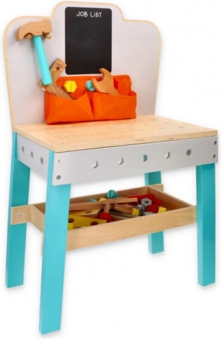 Holztisch mit bunten Plastikinstrumenten wie Hammer und Schrauben. Die Tafel 'JOB LIST' fördert Planung und Kreativität.