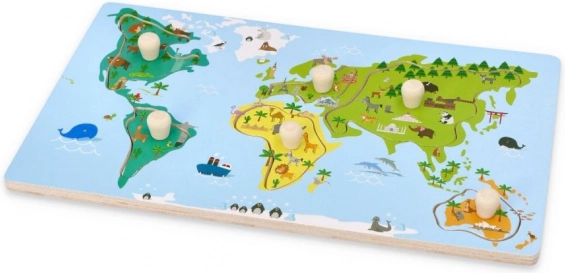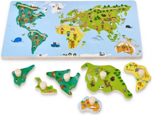 Das Puzzle zeigt Kontinente mit auffälligen Farben und gezeichneten Tieren und Sehenswürdigkeiten, was es Kindern erleichtert, Geographie zu lernen und Spaß zu haben.