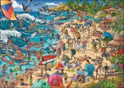 Das zusammengesetzte Puzzle hat die Maße von ca. 70 x 50 cm und ist ideal für gemeinsame Familienzeit oder entspannte Momente allein. Tauchen Sie ein in die lebendige Strandatmosphäre, wo Menschen Surfen, Schwimmen und Entspannen an einem sonnigen Tag genießen.