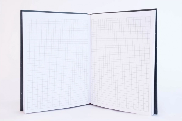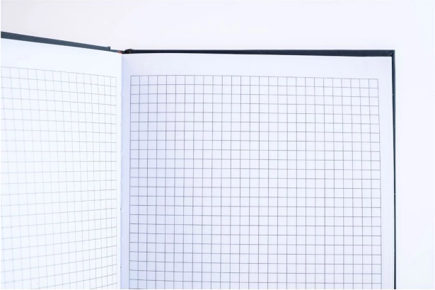 Notizbuch im A5-Format mit festem Einband. Das schwarze Notizbuch hat auf der Vorderseite ein Design mit Weltraumthema. In der Mitte des Covers befindet sich eine weiche, quadratische Platte in Form eines Astronauten. Das Notizbuch enthält 80 karierte Seiten.
