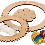 Runde Holzrahmen mit gezahntem Rand halten die Kettfäden stabil, sodass die Muster präzise werden und die Arbeit auch für Einsteiger angenehm ist.