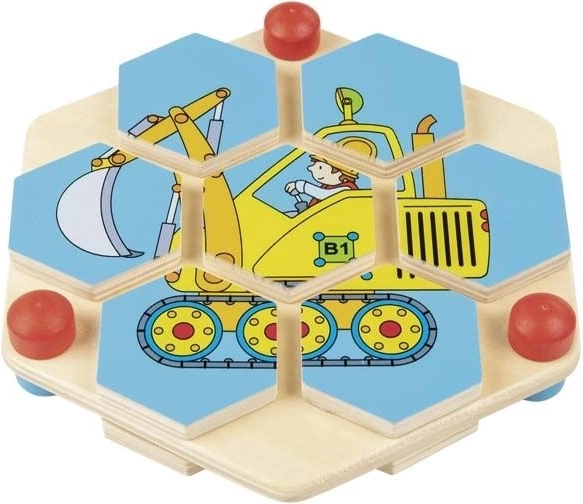 Lassen Sie Ihre Kinder in die kreative Welt dieses wunderschönen Holz-Sechseck-Puzzles eintauchen. Jedes rotierende Sechseck muss korrekt platziert werden, um ein buntes Bild von Baustellenfahrzeugen zu erstellen. Dieses Puzzle ist auf einer stabilen, natürlichen Holzplatte positioniert, die Langlebigkeit und Umweltfreundlichkeit garantiert. Das Spielzeug bietet nicht nur stundenlangen Spaß, sondern hilft auch, das logische Denken und die Hand-Auge-Koordination zu entwickeln.