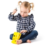 Die massive Holzausführung mit glatten Kanten ist sicher für kleine Hände, die markante gelbe Farbe lädt zum Spielen ein und regt die Fantasie an. Die einfache Aufgabe – die Maus durch den „Labyrinth“-Käse zu fädeln – lässt sich variieren und an die Fähigkeiten des Kindes anpassen.