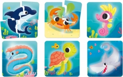 Bunte Bilder von Delfin, Krabbe, Seepferdchen, Aal, Schildkröte und Hai laden zum Puzzeln ein und fördern die Feinmotorik sowie erste logische Überlegungen bei Kindern von 1–4 Jahren.