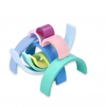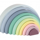 Die Holzscheiben in Pastellfarben wie Blau, Grün und Rosa fördern das Farbverständnis und kreatives Spielen.