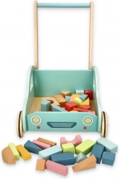 Bunte Holzbausteine fördern die Feinmotorik, die Vorstellungskraft und das logische Denken. Der Wagen dient als praktischer Stauraum für Bausteine und fertige Bauwerke.