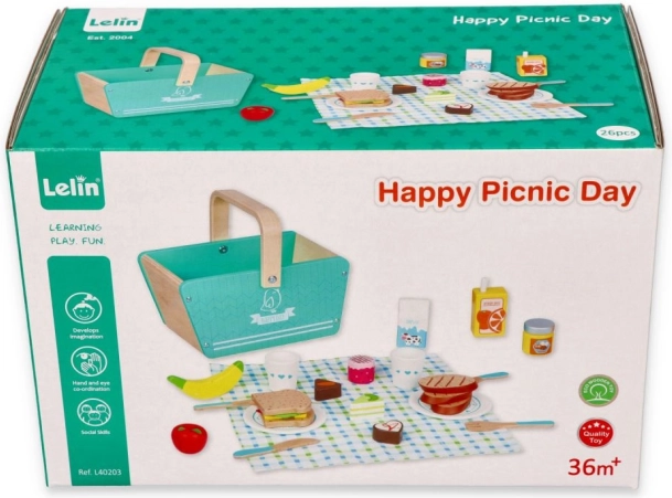 Stilvolles hölzernes Picknick-Set in Minzgrün von LELIN bietet Kindern ab 3 Jahren stundenlange kreative Spielzeit und Lernen. Stabiler Korb, Teller, Besteck und vielfältige Lebensmittel fördern Feinmotorik, soziale Fähigkeiten und das Kennenlernen von Lebensmitteln. Die CE-Zertifizierung bestätigt die Sicherheit.