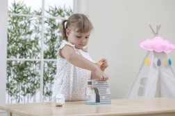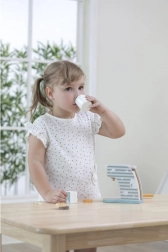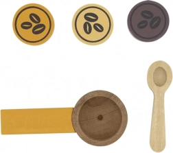 Der Drehknopf, der Siebträger und die Kapseln ermöglichen Kindern, ein „Espresso“ wie im echten Café zuzubereiten. Toller Spielspaß und Förderung der Fantasie.