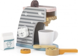 Diese Holz-Kaffeemaschine für Kinder in zarten Farben mit niedlichen Motiven ist für kleine Baristas entworfen. Drehbare Elemente und ein Hebelsystem imitieren eine echte Kaffeemaschine, sodass Kinder „Espresso“ machen, „Milch“ hinzufügen und mit dem Löffel in der weißen Tasse umrühren können.