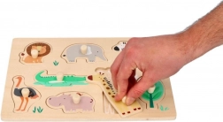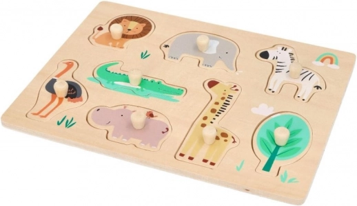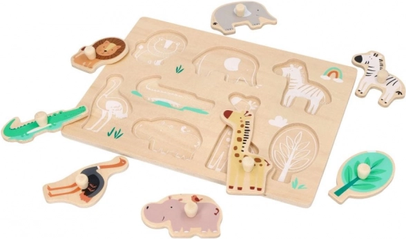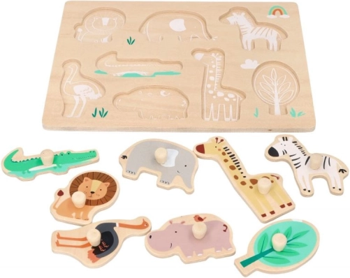Dieses Holz-Puzzle mit Safari-Motiven ist ideal für Kinder ab 12 Monaten. Jedes Puzzleteil stellt ein anderes Tier dar, wie Löwe, Elefant oder Giraffe, was die Erkennung von Tieren fördert. Das Puzzle ist mit Griffen für einfachen Halt und Handhabung gestaltet, was für die Entwicklung der Feinmotorik bei Kleinkindern großartig ist.