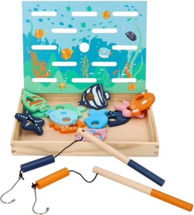 Das Holz-Angelspiel ist für Kinder entworfen, die gerne spielen und neue Dinge lernen. Dieses interaktive Set umfasst Holzruten mit Magneten und bunt bemalte Fische, die so gestaltet sind, dass sie das Fangen echter Fische simulieren.