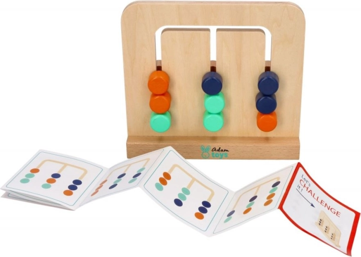 Das Set enthält ein Holzpuzzle mit 9 Blöcken in 3 Farben oder 3 Mustern auf der Rückseite sowie eine zweiseitige Broschüre mit Karten. Der Spaß besteht darin, die Blöcke so anzuordnen, dass sie das von Ihnen gewählte Muster bilden.