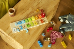 Dieses hölzerne Sortierspiel von GOKI bringt Kindern spielerisches Lernen näher. Jede Zahl von 0–9 hat ihren eigenen Stift und ein farblich abgestimmtes Zahnrad. Kinder können zunächst nach Farben zuordnen und anschließend Zahlen erkennen und zählen lernen. Durch das Drehen eines Rädchens drehen sich die anderen mit – das fördert logisches Denken und das Verständnis von Zusammenhängen.