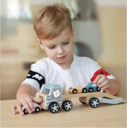 Der zweistufige Anhänger mit kippbarer Rampe unterstützt realitätsnahes Spiel und das Erlernen von Abfolgen – Kinder laden die Autos selbst auf und ab.