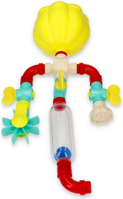 Ein fröhliches Wassersystem mit Trichter, Röhren und Wasserrad bringt Abwechslung in jedes Bad. Das Kind gießt Wasser in den Trichter und beobachtet, wie der Wasserstrom verschiedene Wege nimmt. Dieses interaktive Spielzeug fördert die Hand-Auge-Koordination und unterstützt das natürliche Entdecken physikalischer Phänomene.