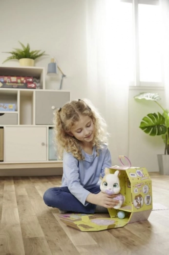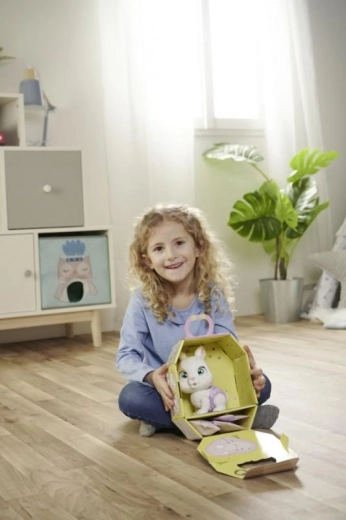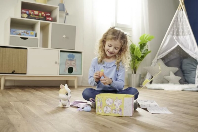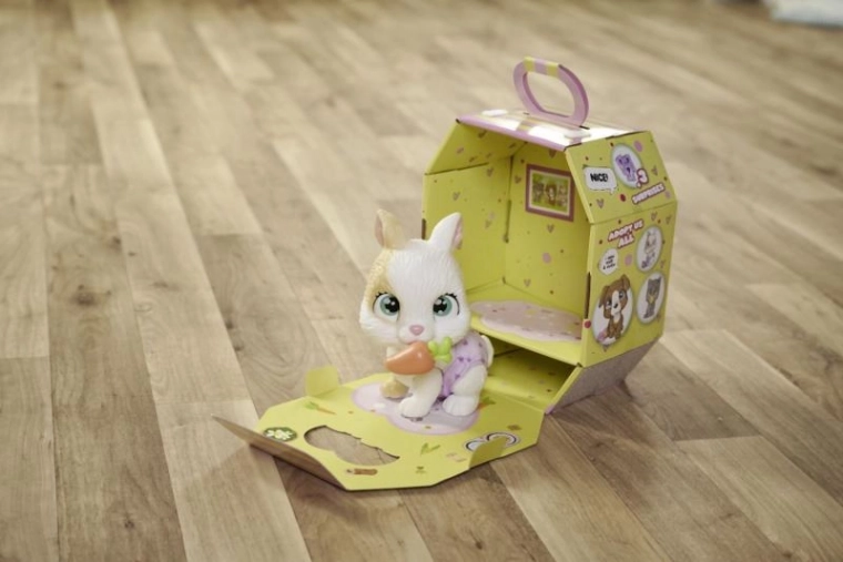 Dank der Papierverpackung mit Henkel, die als tragbares Häuschen dient, kannst du das Häschen überallhin mitnehmen. Im Inneren warten zudem Papiertütchen mit Überraschungen – thematische Accessoires für noch mehr Spielideen. Die magische Pfote verrät das Geschlecht des Tiers und hilft Kindern, eine persönliche Bindung aufzubauen.