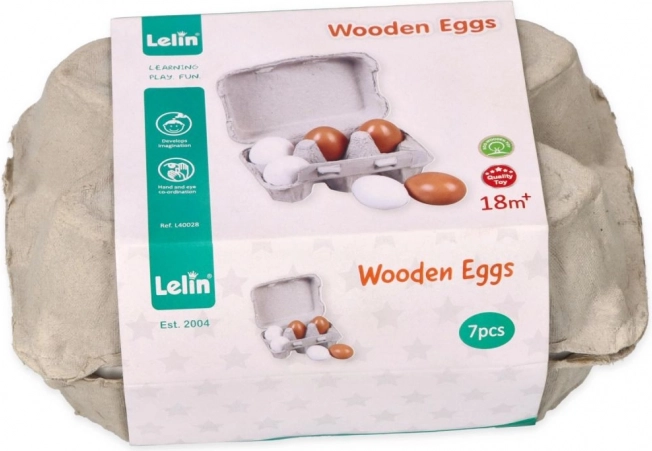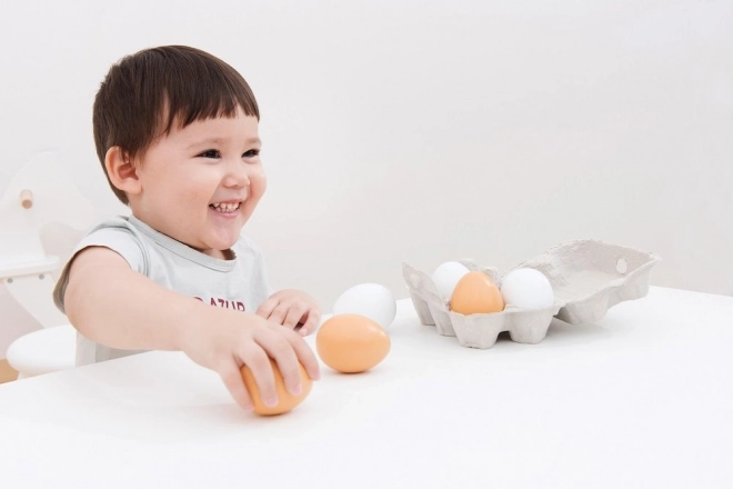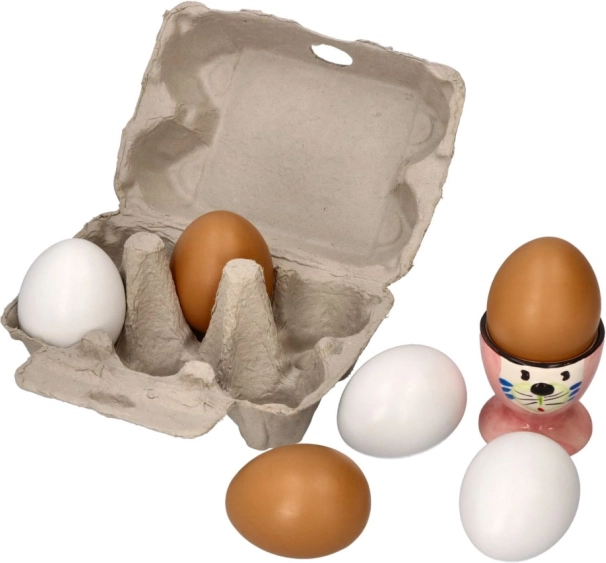 Holzeier im Karton stellen das perfekte Spielzeug für Kinder ab 3 Jahren dar. Die Packung enthält sechs Eier, davon drei braune und drei weiße, ideal für sicheres und unterhaltsames Spielen.