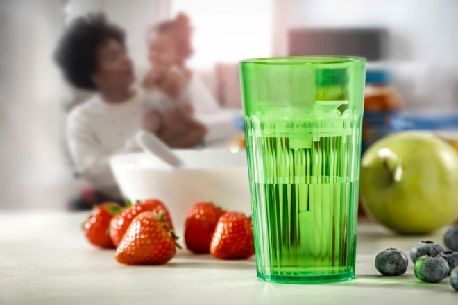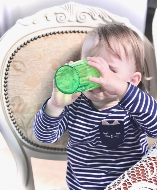 Ein spezieller Einsatz im Inneren des Bechers verlangsamt den Flüssigkeitsstrom, sodass das Kind sicher das Trinken aus einem offenen Becher ohne Sauger und Strohhalme erlernt.
