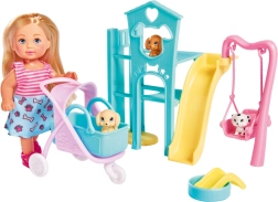 Evi ist von 3 Welpen auf einem Kinderspielplatz mit Schaukel umgeben, inklusive Kinderwagen.