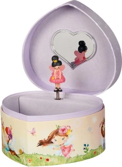 Dieses bezaubernde Schmuckkästchen im Stil einer Spieluhr vereint ein magisches Design mit praktischem Stauraum. Beim Öffnen des Deckels ertönt die bekannte Melodie Schwanensee und ein kleines Feenfigürchen beginnt sich vor dem Herzspiegel zu drehen. Die Box ist ein wunderbares Geschenk für Kinder, die Schmuck und märchenhafte Motive lieben.