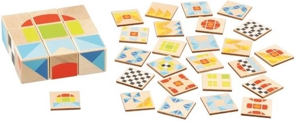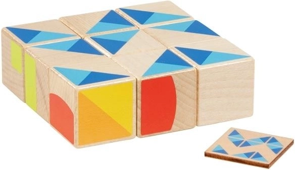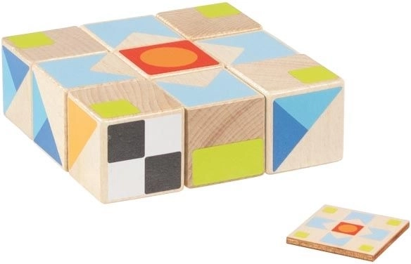 Das Holz-Puzzle-Spiel Kubus II von der Marke GOKI kombiniert Kreativität und Logik. Kinder können ihre kognitiven Fähigkeiten entwickeln mit Hilfe von bunten geometrischen Formen auf den Würfeln.