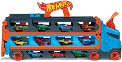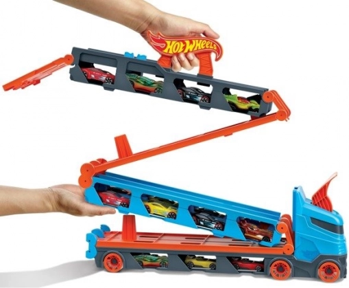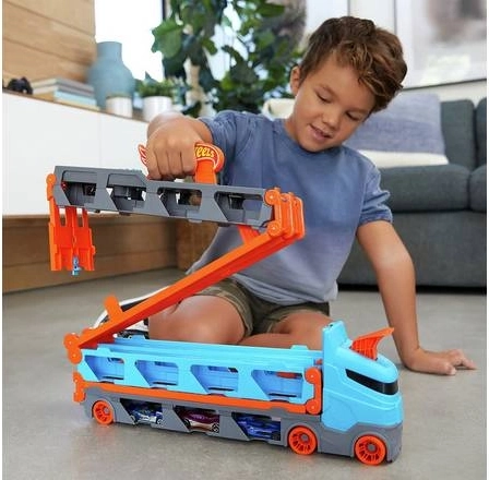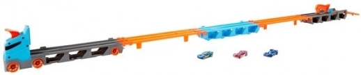 Verwandle den Lkw im Handumdrehen in eine vollwertige Rennstrecke. Der Transporter verstaut bis zu 20 Autos hinter transparenten Fenstern – so hast du deine Sammlung immer im Blick. Mit einem Zug am Griff klappt der Auflieger zu einer zweispurigen Strecke von 1,8 m aus, während sich die Kabine in eine doppelte Startstation für faire Starts verwandelt.