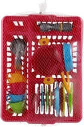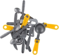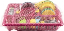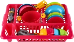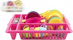 Ein fröhliches Kinderspielküchen-Set in einem praktischen Abtropfgestell bringt stundenlange kreative Unterhaltung. Enthält alles, was kleine Köchinnen und Köche brauchen: Teller, Tassen mit Untertassen, Besteck, Topf mit Deckel und Pfannen. Kräftige Farben ziehen die Aufmerksamkeit auf sich und fördern Fantasie, Feinmotorik und Ordnungssinn – nach dem „Kochen“ wird das Geschirr einfach in das Abtropfgestell gestellt wie bei Mama.