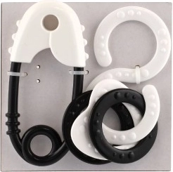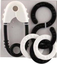 enthält eine klassische Sicherheitsnadel und eine Acht mit Ringen.