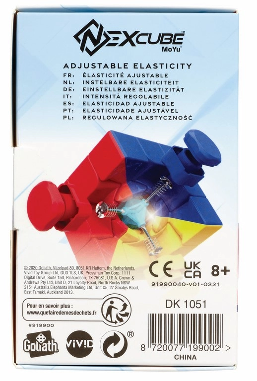 Der Nex Cube von Goliath ist ein einzigartiger Würfel, hergestellt von der bekannten und anerkannten Firma MoYu. Anstelle leicht verkratzbarer Aufkleber verwendet der Würfel durchgefärbte Kunststoffe. Dank der Verwendung von durchgefärbtem Kunststoff statt einer lackierten Oberfläche behalten die Würfelseiten auch nach mehreren Monaten Nutzung ihre Farben. Die Mittelteile (Zentren) des Würfels lassen sich entfernen; darunter befindet sich eine Schraube, mit der der „Anpressdruck“ jeder Seite eingestellt werden kann. Der Würfel verfügt über speziell profilierte Elemente, wodurch er Ecken sanft „abschneidet“, was das Lösen zusätzlich beschleunigt.