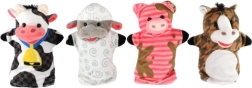 Das Set enthält vier Farm-Handpuppen: eine Kuh, ein Schaf, ein Schweinchen und ein Pferd, ideal zum Erzählen von Märchengeschichten.