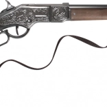 Dieses stylische Unterhebelgewehr kombiniert einen Metallkorpus mit einem „holzfarbenen“ Schaft und trägt reichhaltige dekorative Gravuren. Dank der stabilen Metallkonstruktion ist es ideal für häufiges Spielen und passt perfekt zu kindlichen Western-Abenteuern. Die orangefarbene Mündungskappe signalisiert deutlich, dass es sich um ein Spielzeug handelt.