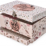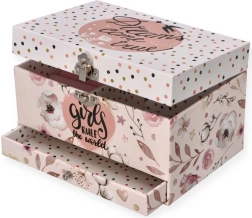 Im unteren Bereich befindet sich eine ausziehbare Schublade für zusätzlichen Stauraum, ein sicheres Metallschloss und eine robuste Verarbeitung aus leichtem Material, ideal fürs Kinderzimmer. Schriftzüge im Stil von „Girls rule the world“ und „Dreams come true“ verleihen einen verspielten Look und fördern die kreative Fantasie.