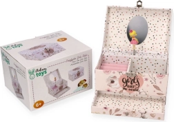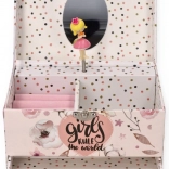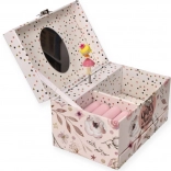 Dieses zarte rosa Schmuckkästchen mit Blumen- und Punktmuster birgt alles, was kleine Damen lieben: Beim Öffnen des Deckels erklingt eine Melodie und die Ballerina dreht sich auf der Spindel vor dem ovalen Spiegel. Innen erwartet Sie ein praktisch unterteilter Raum mit Ringkissen und Fächern für kleine Schätze.