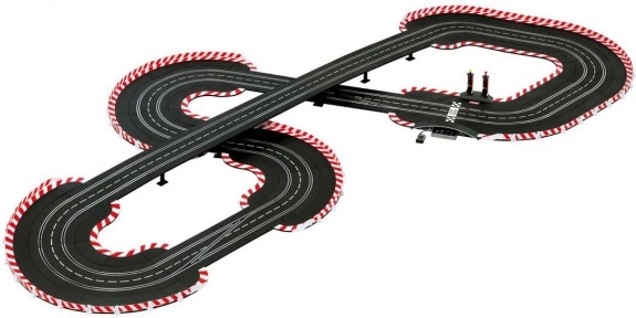 Modularer Achtkurs mit Doppeltbrücke, Überholteilen und breiten Kurven 1/60° für flüssige Zweikämpfe und Drifts.