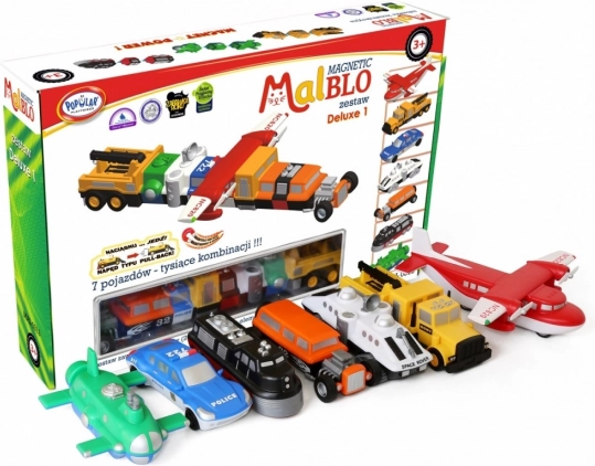 Das MalBlo MAGNETIC Deluxe Baukasten-Set ist ein cleveres Spielzeug für kleine Konstrukteurinnen und Konstrukteure. 21 Elemente im Set (7 fertige Fahrzeuge) ermöglichen mehr als 1000 unterschiedliche Kombinationen – von Autos und Sattelschleppern bis hin zu Flugzeugen oder Maschinen der Zukunft. Die Teile bieten die ideale magnetische und mechanische Verbindung, lassen sich leicht bedienen und halten dennoch sicher zusammen.
