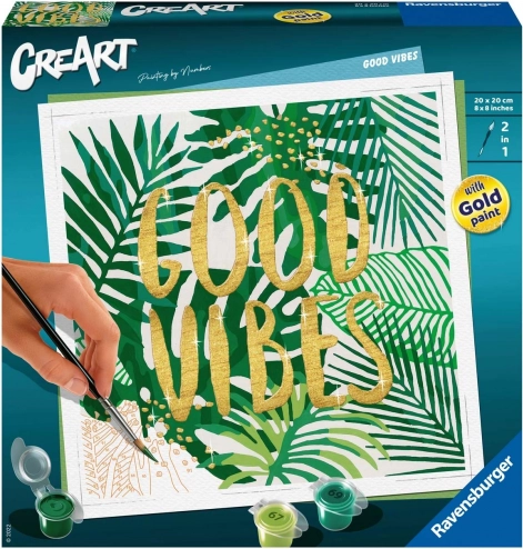 Das Set CreArt: Good Vibes bietet eine unterhaltsame und entspannende Möglichkeit, in die Welt der Kunst einzutauchen. Dank des übersichtlichen Malens nach Zahlen können Anfängerinnen und Anfänger sowie fortgeschrittene junge Kreative farbenfrohe und beeindruckende Bilder ohne Angst vor Fehlern gestalten. Die kompakten Abmessungen erleichtern das Aufbewahren und Mitnehmen – so können Sie jederzeit und überall kreativ sein.