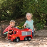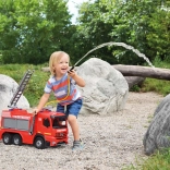 Die Kolbenpumpe und der 1,5-l-Tank erzeugen einen kräftigen Strahl für realistische Feuerwehreinsätze. Die drehbare Düse erleichtert das Zielen.