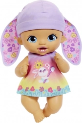 Die Puppe besteht aus robustem Kunststoff, hat markante blaue Augen, einen süßen Mund und eine lilafarbene Mütze mit Hasenohren. Ebenfalls enthalten ist ein Beißring, der die sensorische Entwicklung fördert. Die Verpackung unterstützt Nachhaltigkeit – nach dem Auspacken dient sie als praktische Wiege.